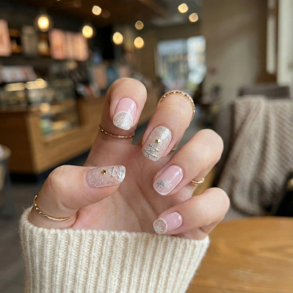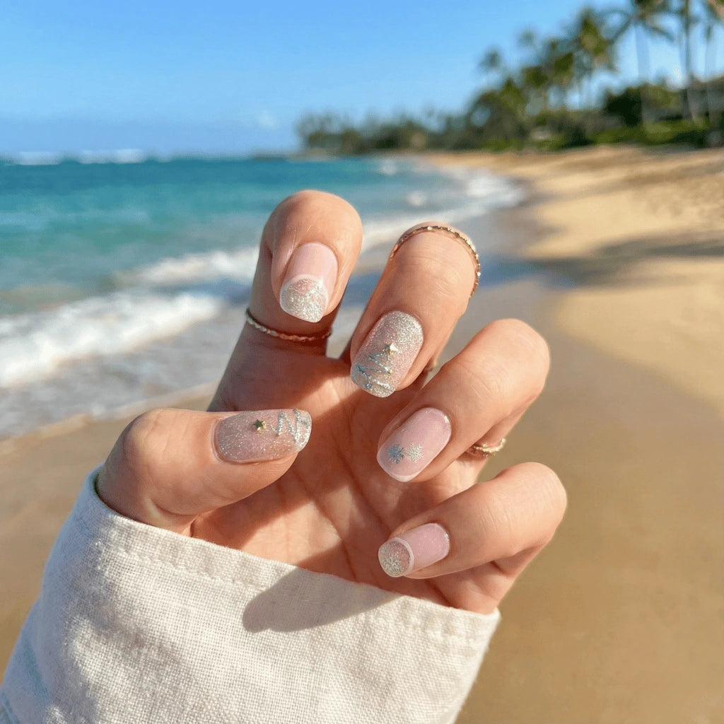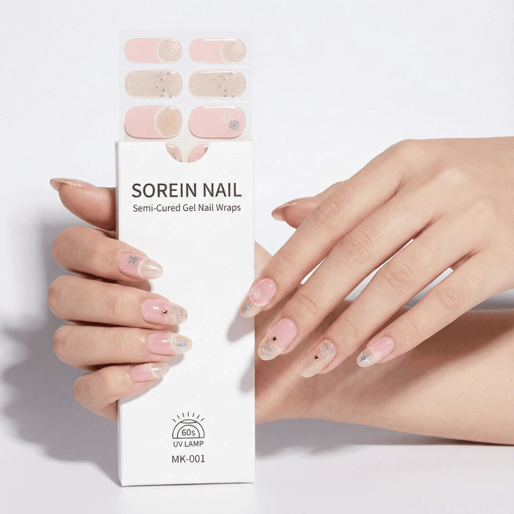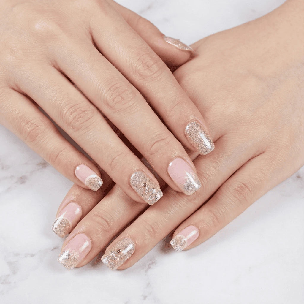 מדבקת לק ג'ל חצי מוקשה בגוון ניוד עדין עם שילובי כסף. העיצוב הזה פשוט נראה בול על היד ונותן הרגשה נקייה ומסודרת . יש בו משהו עדין וכיפי שמשתלב מהמם ולא משעמם לרגע כי כל ציפורן מקבלת קצת תשומת לב אחרת.
