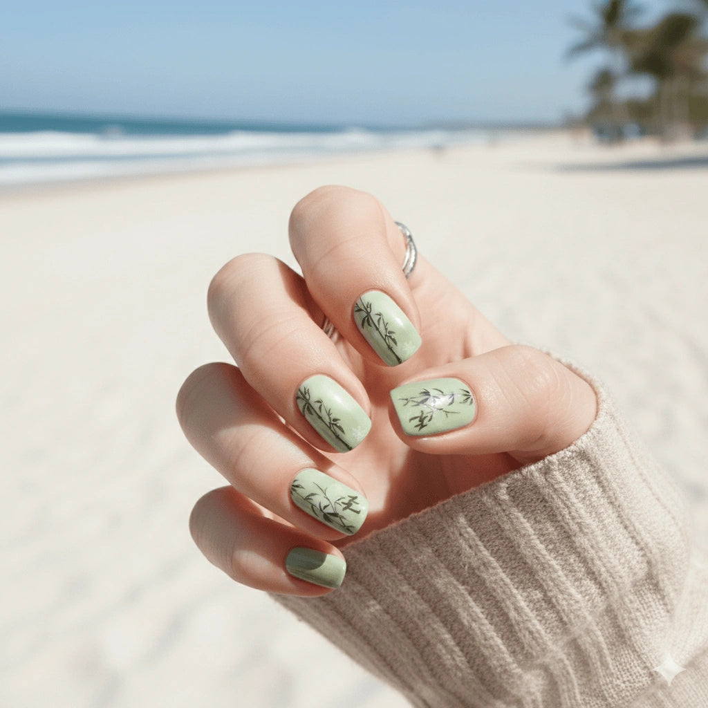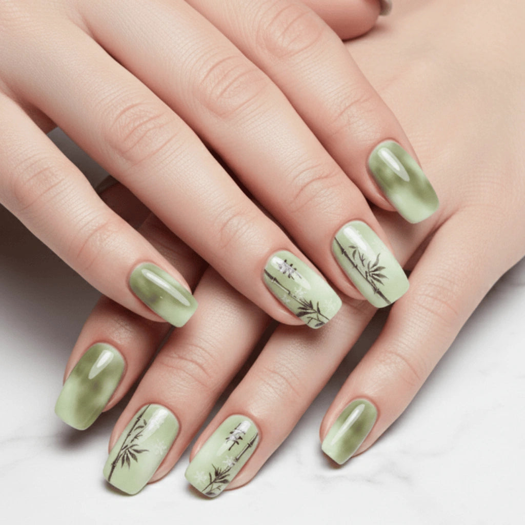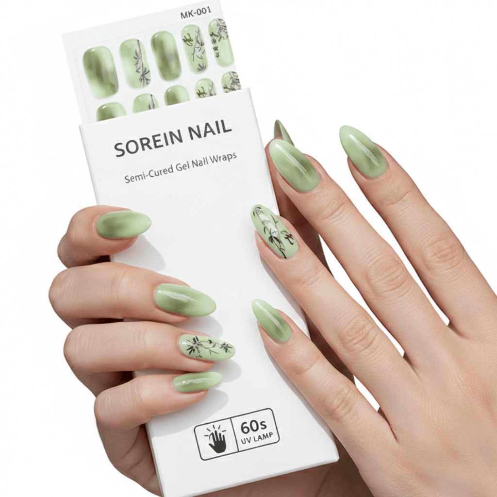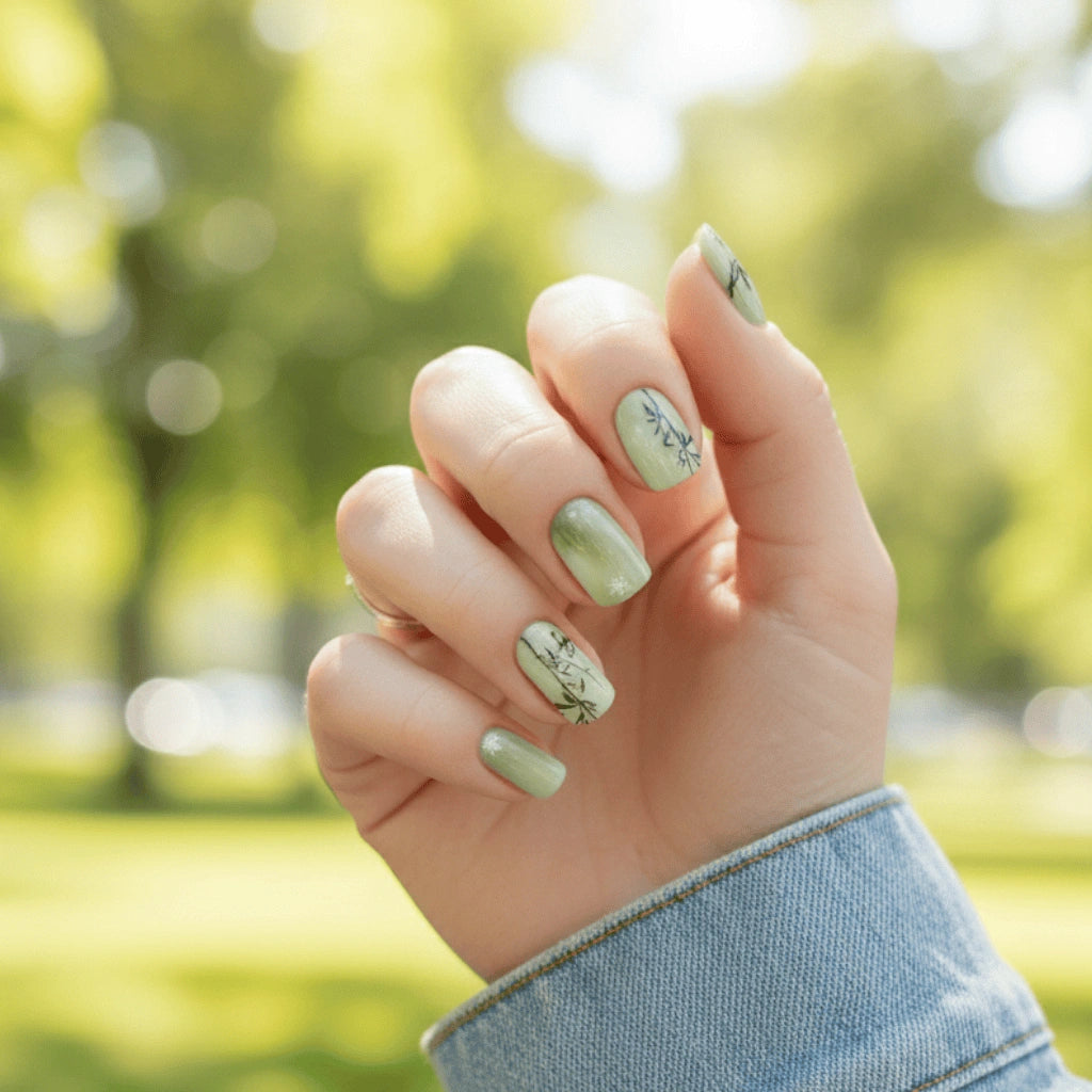 מדבקת לק ג'ל חצי מוקשה בגוון ירוק מרווה עם איורי ענפים עדינים הוא נותן לציפורניים מראה אומנותי ורך