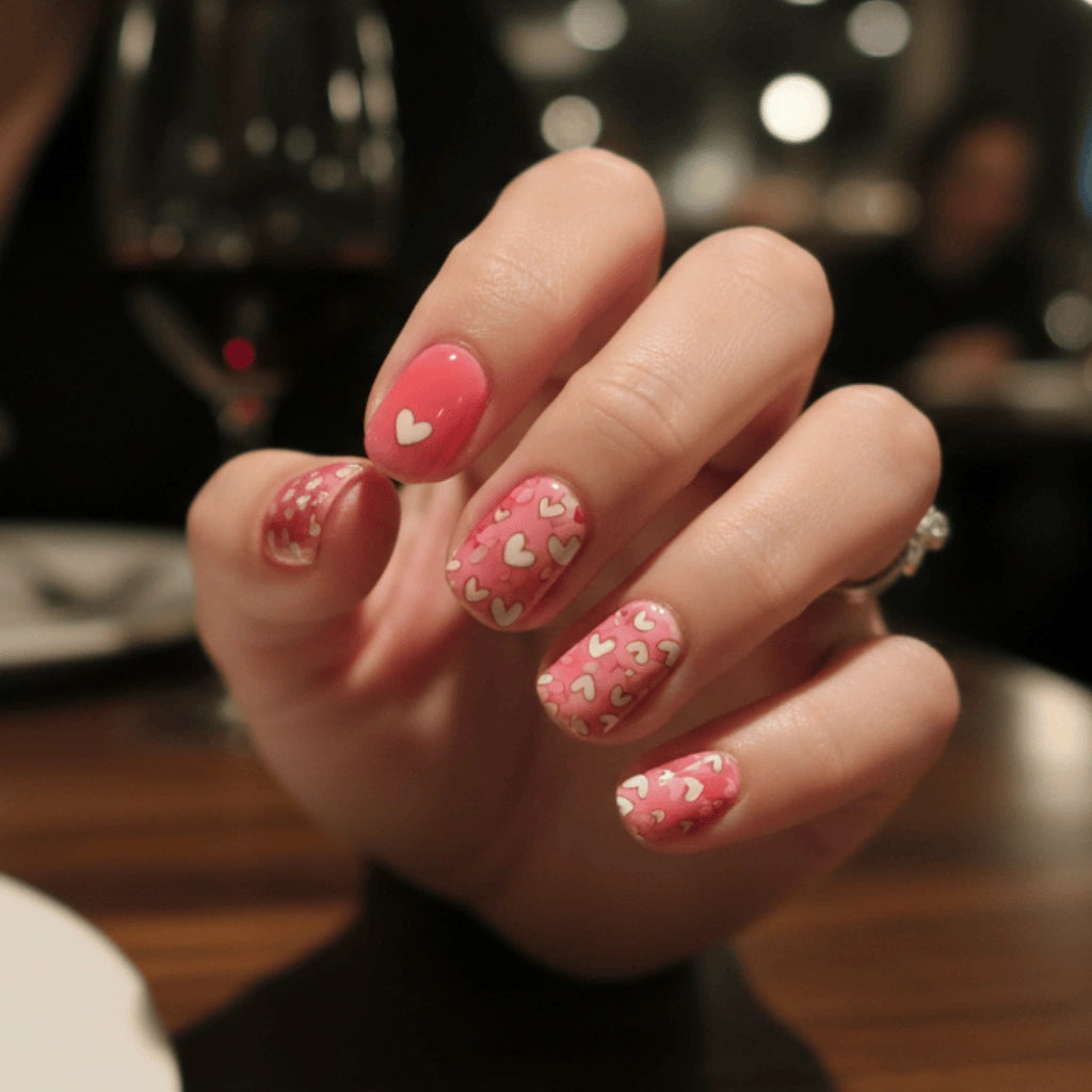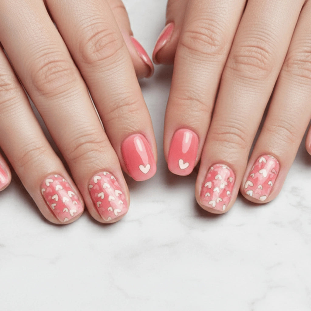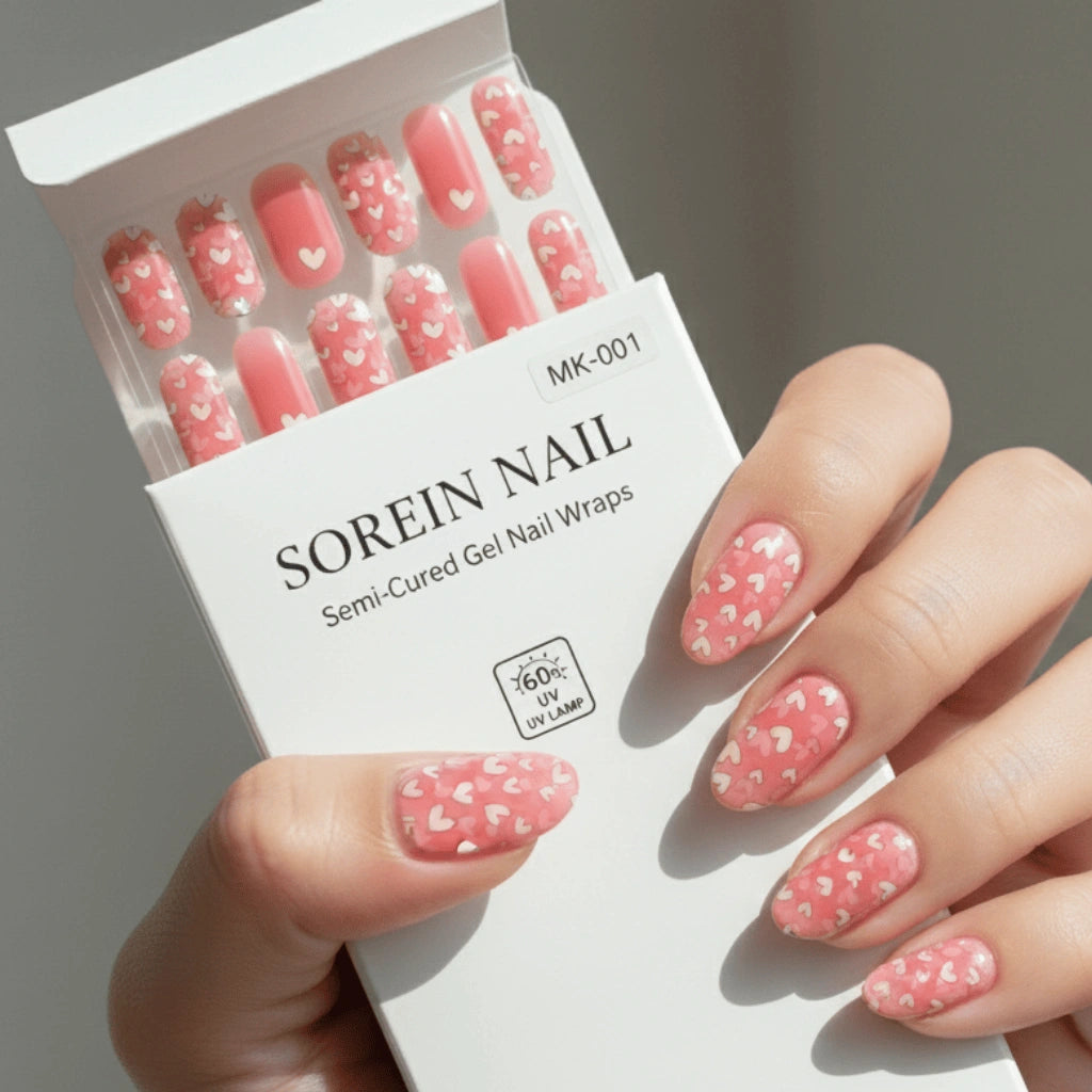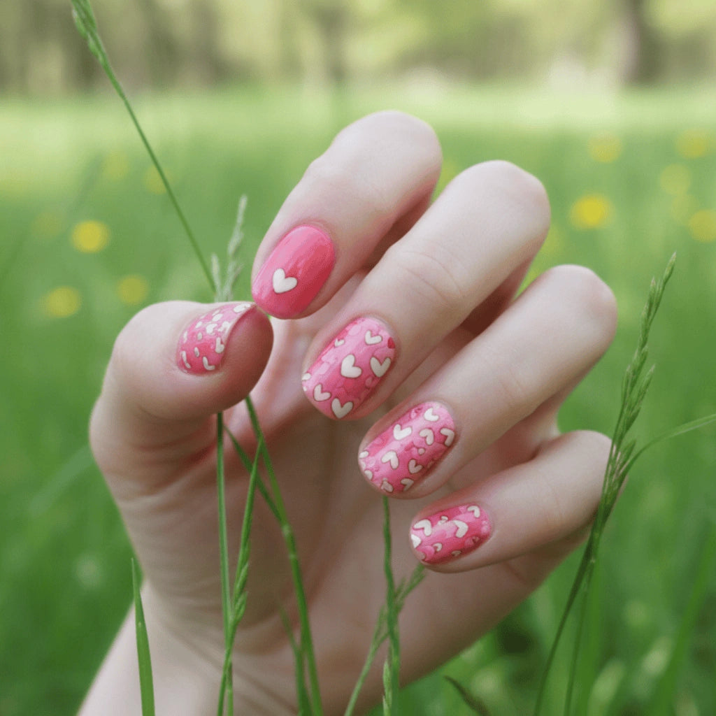 מדבקת לק ג'ל חצי מוקשה בגוון ורוד מתוק עם איורי לבבות.