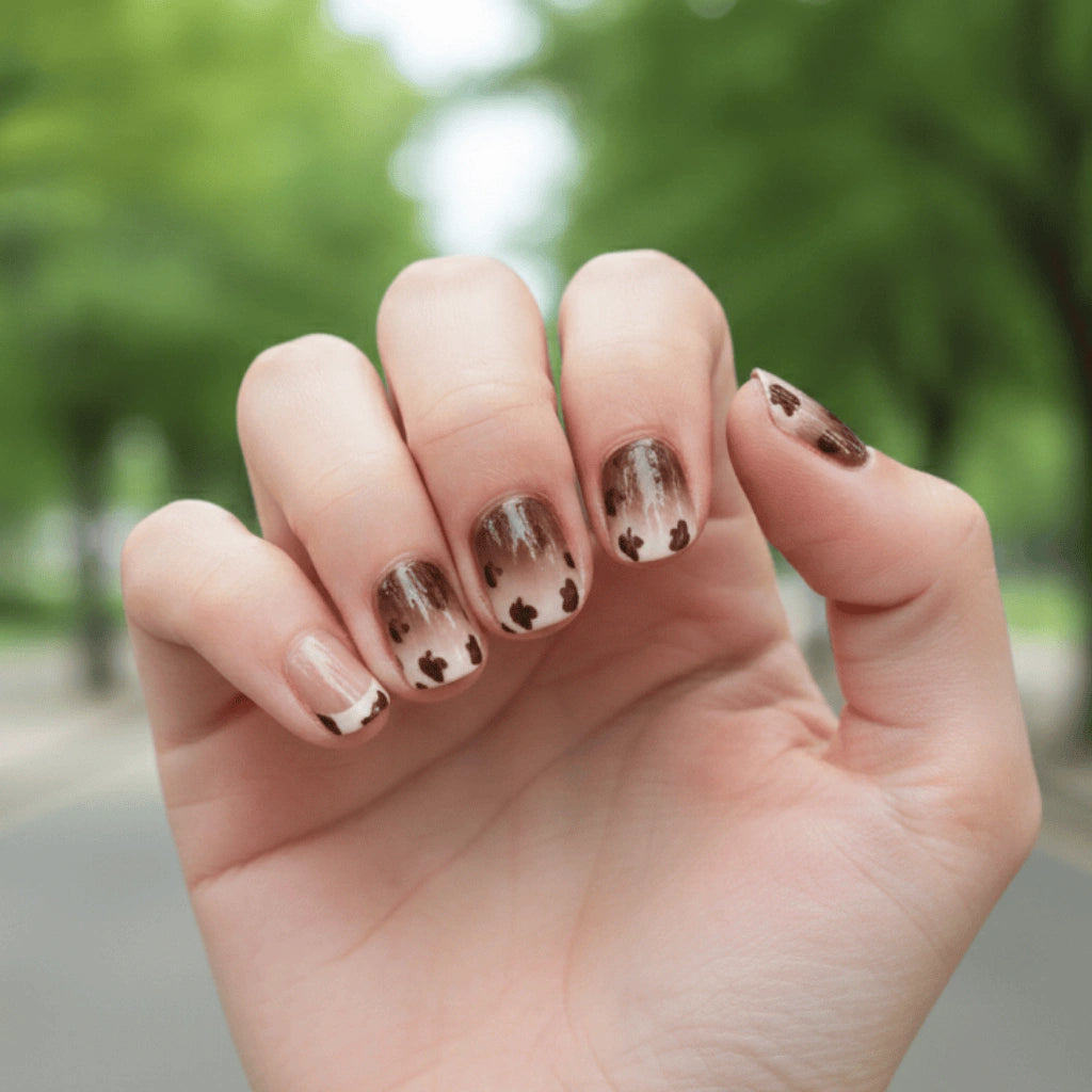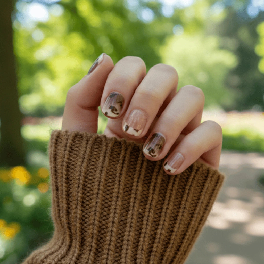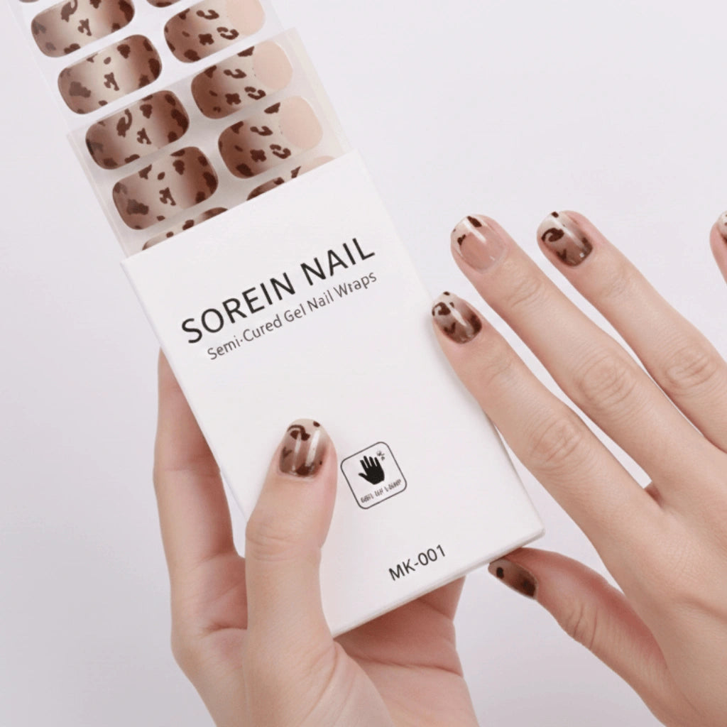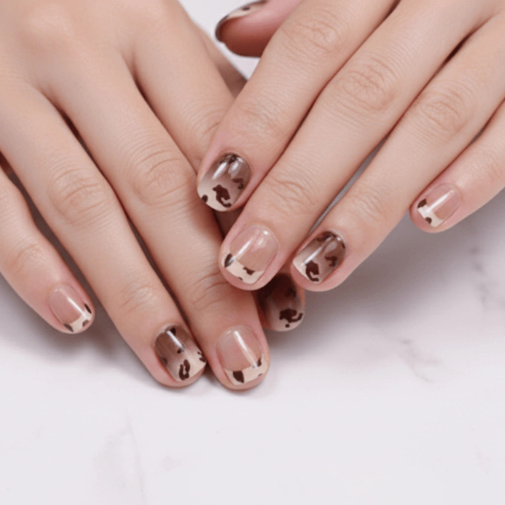 ג'ל מנומר חום מדבקת לק ג'ל חצי מוקשה בגוון חום ובייז' עם דוגמת נמר